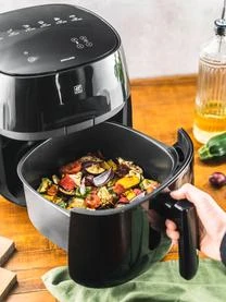 Die ZWILLING Heißluftfritteuse zaubert herzhafte und süße Speisen in Windeseile auf den Teller. Knusprige Pommes, Pizza, Muffins und vieles mehr lassen sich darin einfach zubereiten. Du kannst in der Fritteuse ohne oder mit wenig Fett bzw. Öl frittieren, aber auch garen und backen. Auf dem LED-Touch-Screen können sechs voreingestellte Programme für Pommes, Hähnchen, Garnelen, Fisch, Pizza und Kuchen ausgewählt werden. Temperatur und Zeit lassen sich aber auch individuell einstellen.